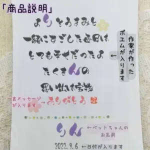 ※同じペットちゃんのお名前でご注文の場合、ポエムの内容は一緒になります。メッセージや文字色はご希望にそわせていただきますので、備考欄にご記入ください。