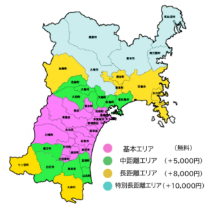 基本エリア以外へ訪問する場合、お伺い費用として中距離エリア:+5,000円、長距離エリア+8,000円、特別長距離エリア+10,000円を別途頂戴いたします。